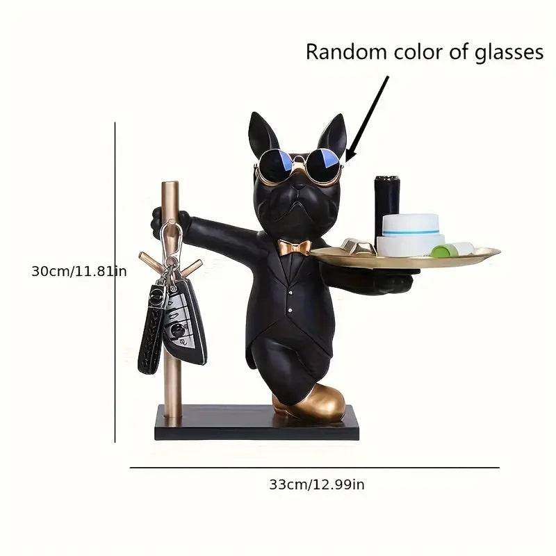 Vestido con traje negro, moño dorado y gafas de sol, sostiene una bandeja dorada ideal para colocar llaves, joyas o accesorios. Fabricado con resina de alta calidad, combina estilo moderno con un diseño funcional que se adapta perfectamente a entradas, escritorios o salas de estar.